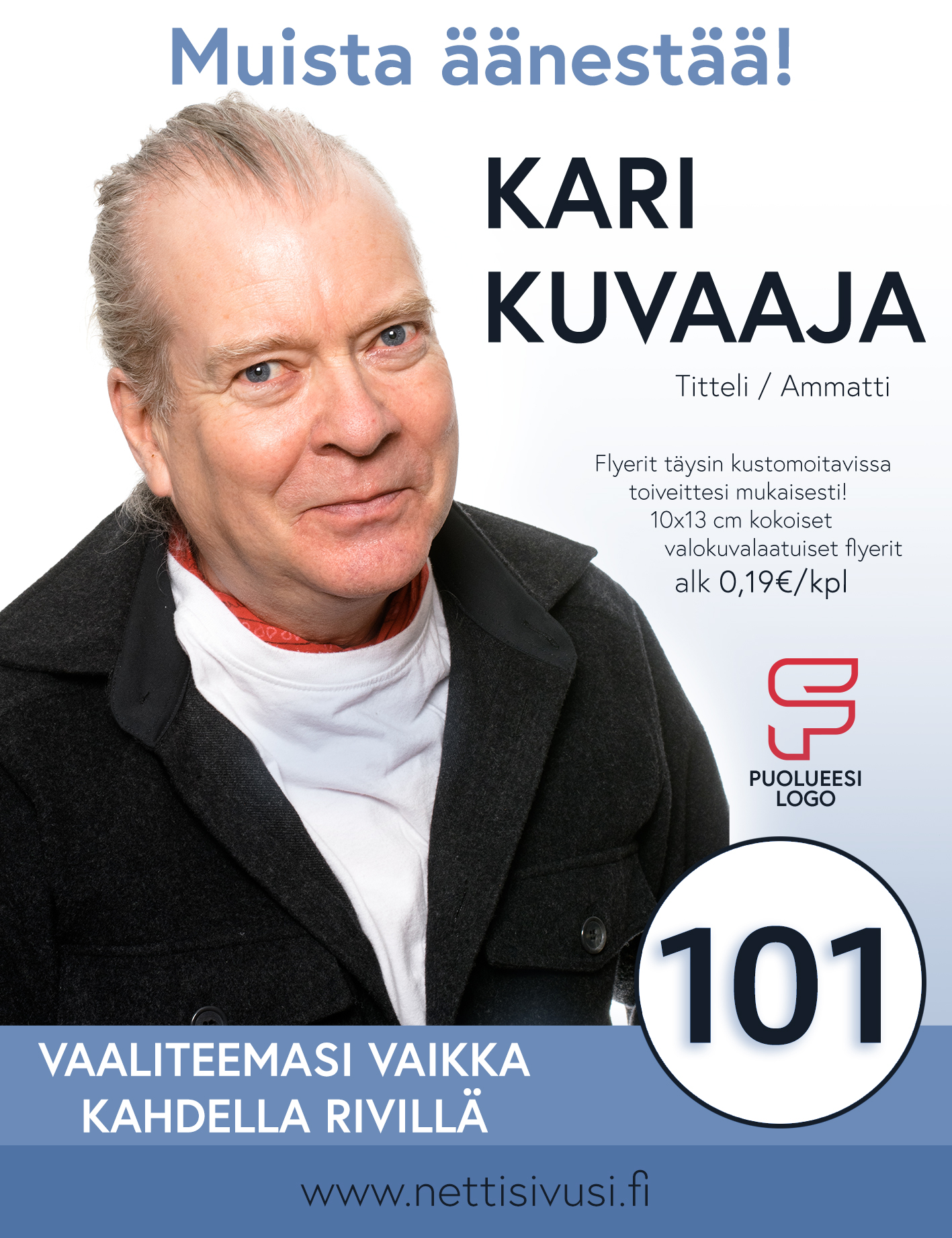 Laadukas flyeri jää varmasti mieleen ja auttaa muistamaan ehdokkaan äänestykseen saakka. Hinta ei sisällä graafista suunnittelua, mutta suunnittelemme mainokset mielellämme! Flyereita voi tilata myös muun kokoisissa erissä. Pyydä tarjous lähettämällä meille sähköpostia osoitteeseen kuvat@fimaka.fi
