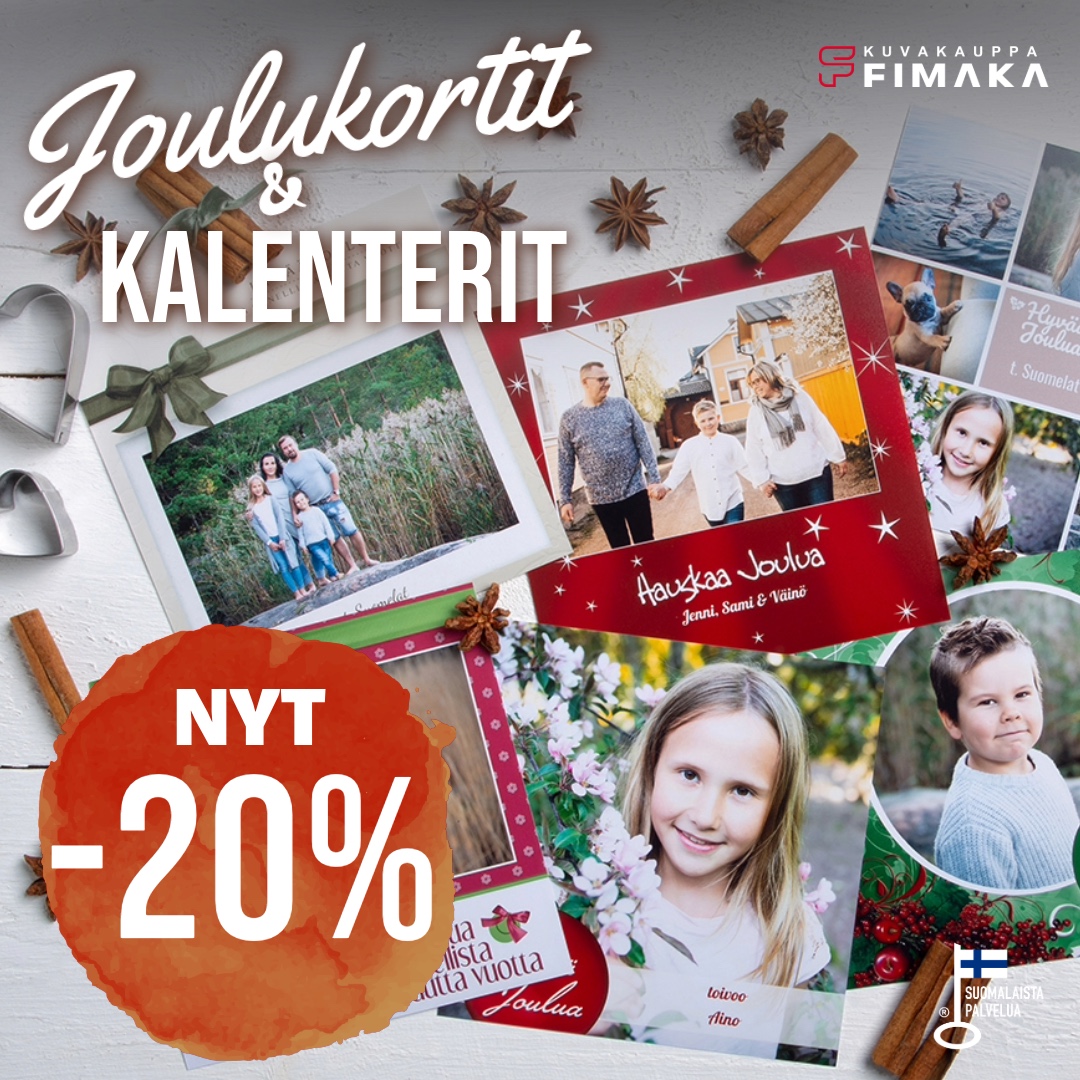 Aikainen lintu madon nappaa ja aikainen tilaaja nappaa myös tämän huikean alennuksen kaikista joulukorteista sekä kalentereista. Tilauspalvelumme kautta tilaat persoonalliset tuotteet omista kuvistasi vaivattomasti ja nopeasti. Valmistamme kaikki tilaukset aina pikana, joten suosi suomalaista ja saat tuotteesi nopeasti!