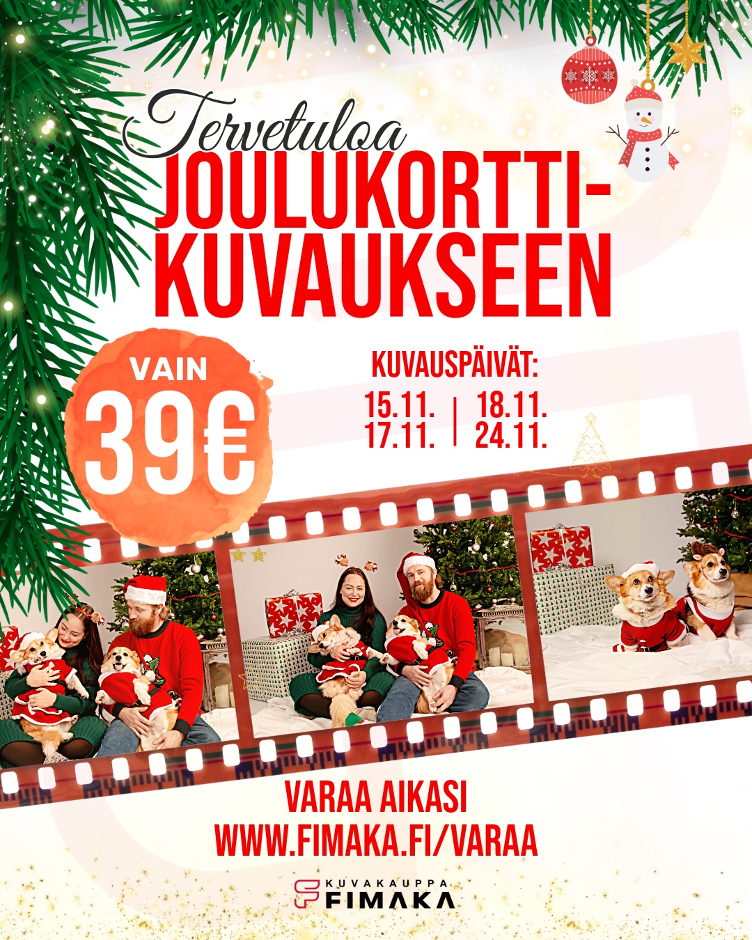 Iloisessa kuvauksessa otamme joulukorttikuvat lapsista, lemmikeistä tai vaikka koko perheestä (max 6 henk.). Hinta sisältää kuvauksen lisäksi yhden digitaalisen kuvan, josta voit tilata helposti joulukortit, canvas-taulut sekä muut kuvatuotteet laajasta valikoimastamme!