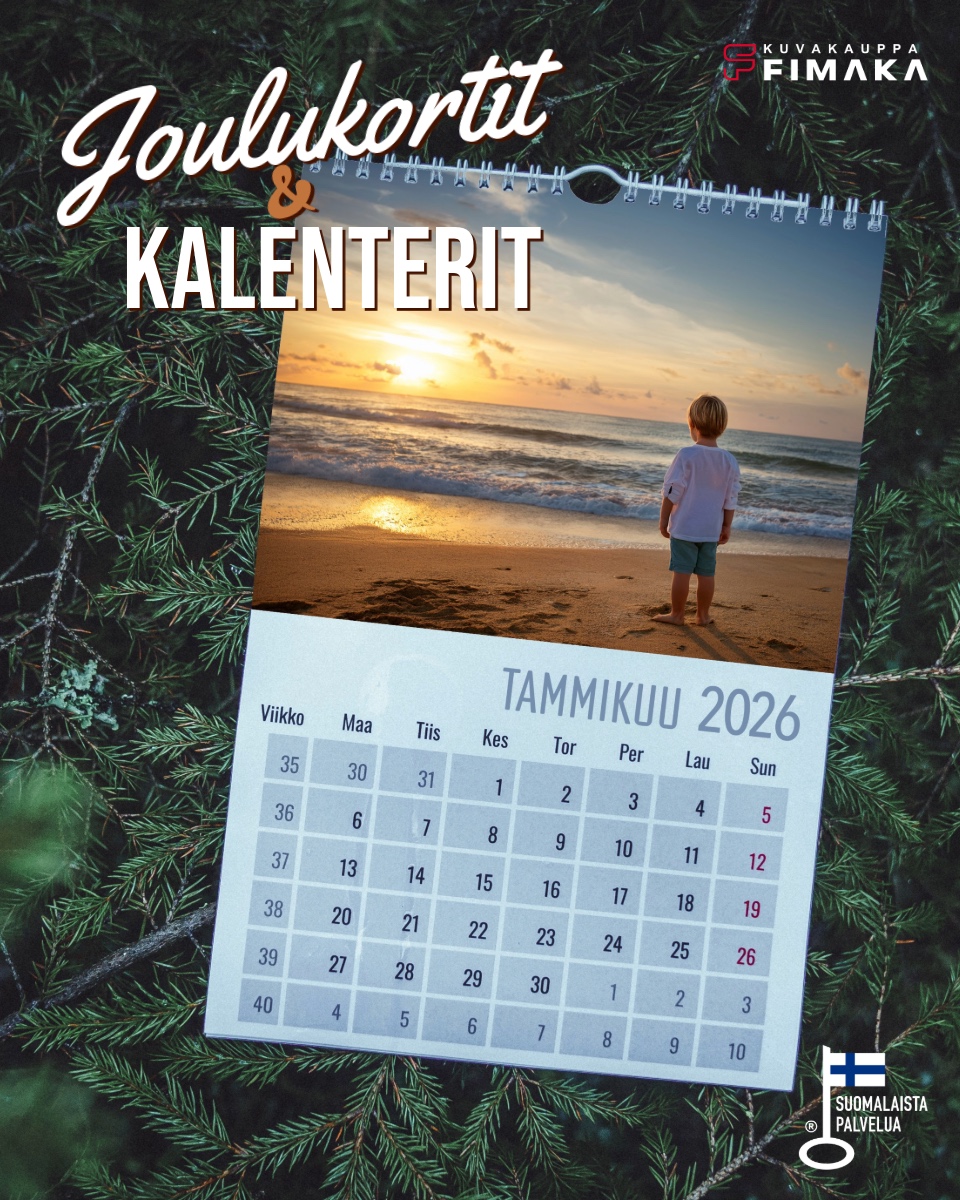 Tilauspalvelumme kautta tilaat persoonalliset tuotteet omista kuvistasi vaivattomasti ja nopeasti. Vielä ehdit siis tilaamaan jouluksi kaikki lahjatuotteet, kalenterit vuodelle 2026 sekä tietenkin joulukortit annettavaksi läheisille.